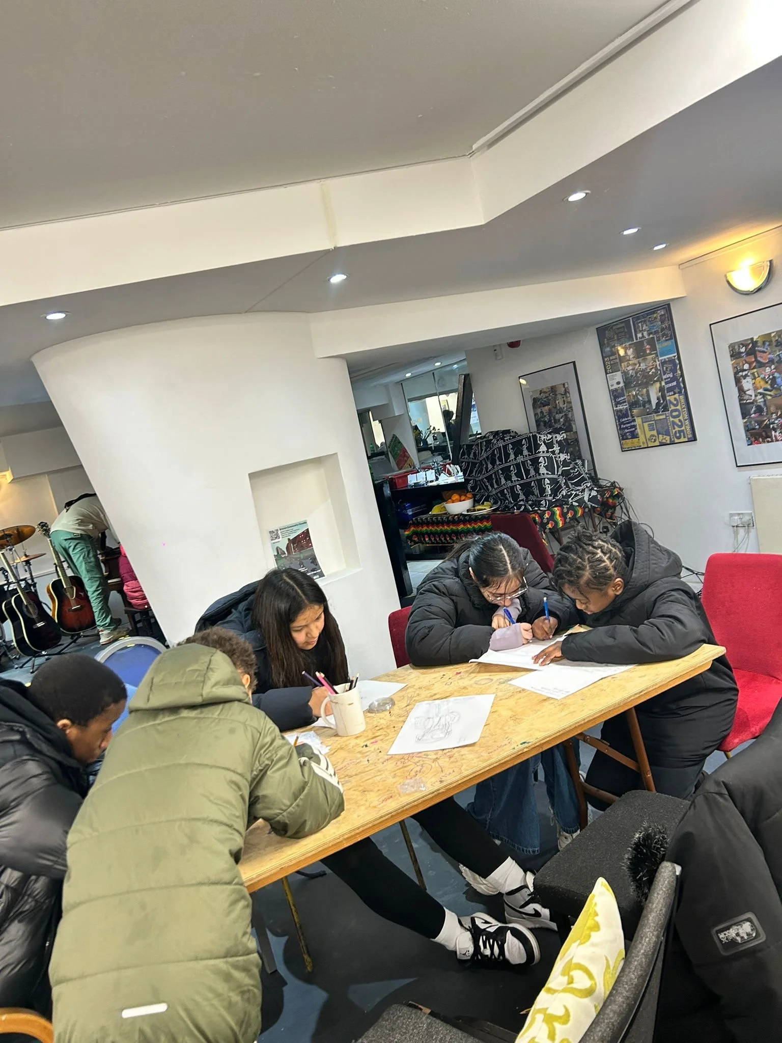 We closed the week with a drawing and guitar workshop led by Jacob Samuels. The session created space for young people to experiment with rhythm, lyrics and visual storytelling.